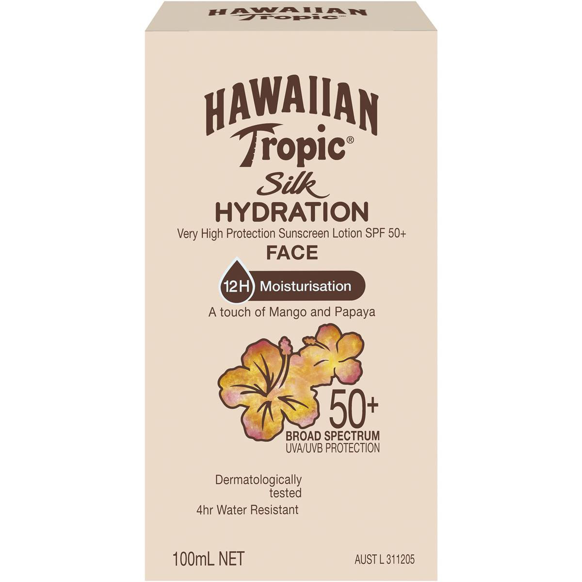 Hawaiian Tropic Silk Hydration Face Lotion SPF50+ combines a high protection with a hydrating formula to wrap your skin in 12 hours of continuous moisture. The oil free, fast absorbing formulate provides a silky, non-greasy skin feel for your face.