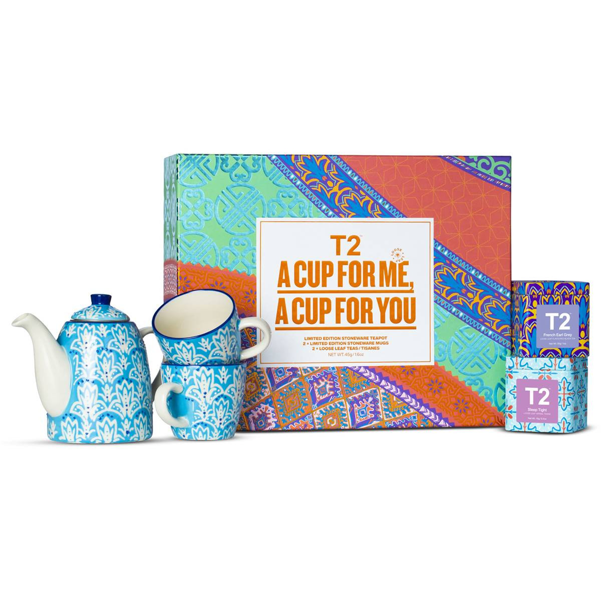 1 x Limited Edition Stoneware teapot, 2 x Limited Edition Stoneware cups and 2 x Loose Leaf Tea/Tisane Mini Tins containing: French Earl Grey 35g and Sleep Tight 15g