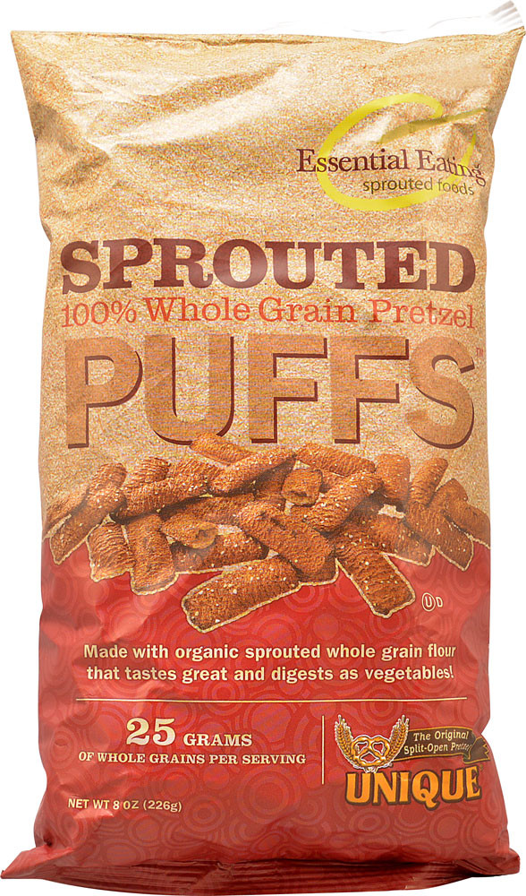 Essential Eating pioneered an organic process that duplicates nature's balance of sunshine and rain to sprout organic whole grains into plants so your body can now digest them as vegetables and not dried seeds, or starches! Most importantly, Essential Eating tests to assure the nutrients and antioxidants are captured at their peak and milled into great tasting wholesome Pretzels Puffs that give you the benefit of whole grains, yet digest the same as vegetables. These one of a kind Pretzel Puffs are 100% whole grain fiber, heart-healthy, kosher, vegan, diabetic-friendly and is naturally free of cholesterol, lactose, added sugar and trans fats.