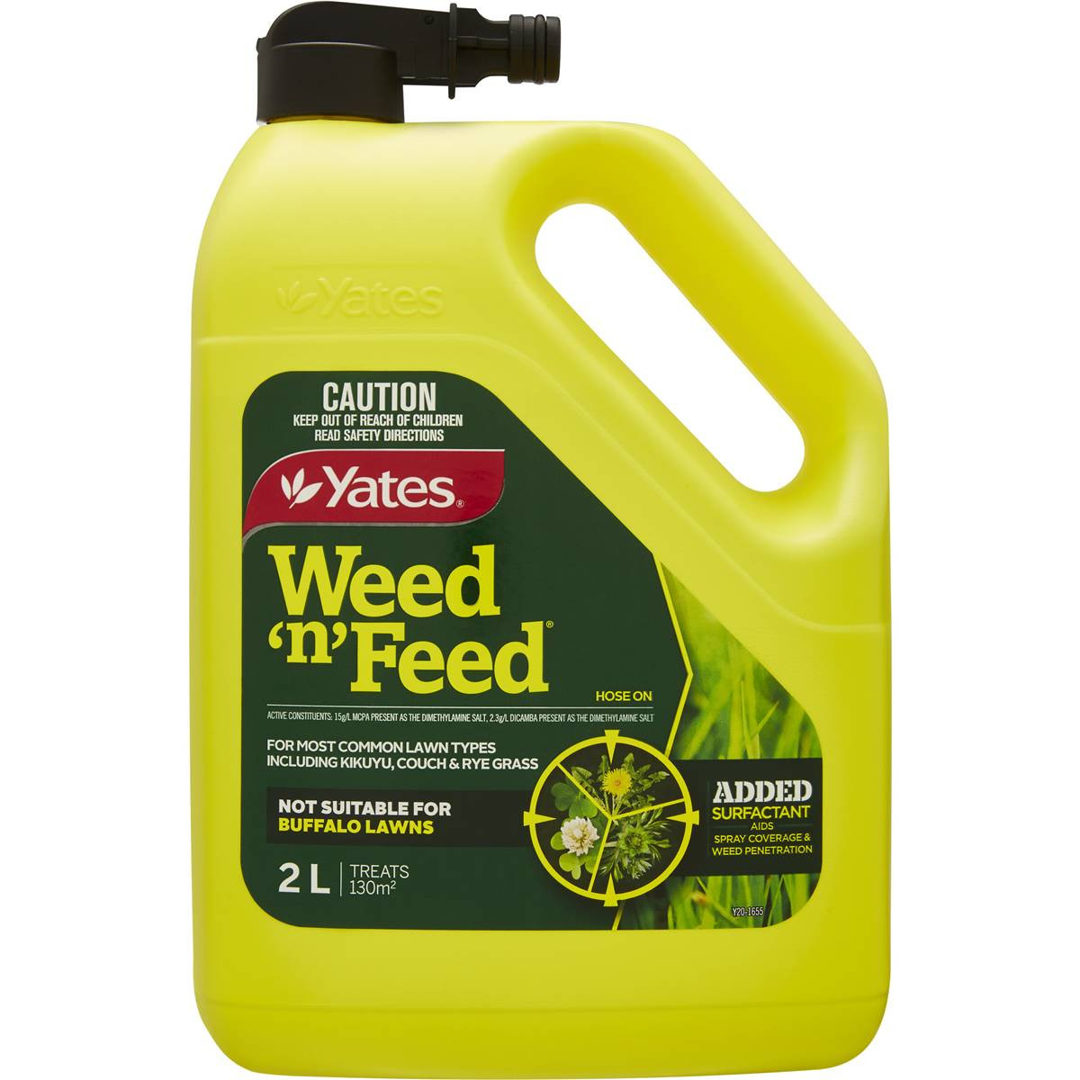 Selective control of most broadleaf weeds in home garden lawns with nitrogen fertiliser for healthy green lawn growth. Easy to apply, hose-on.