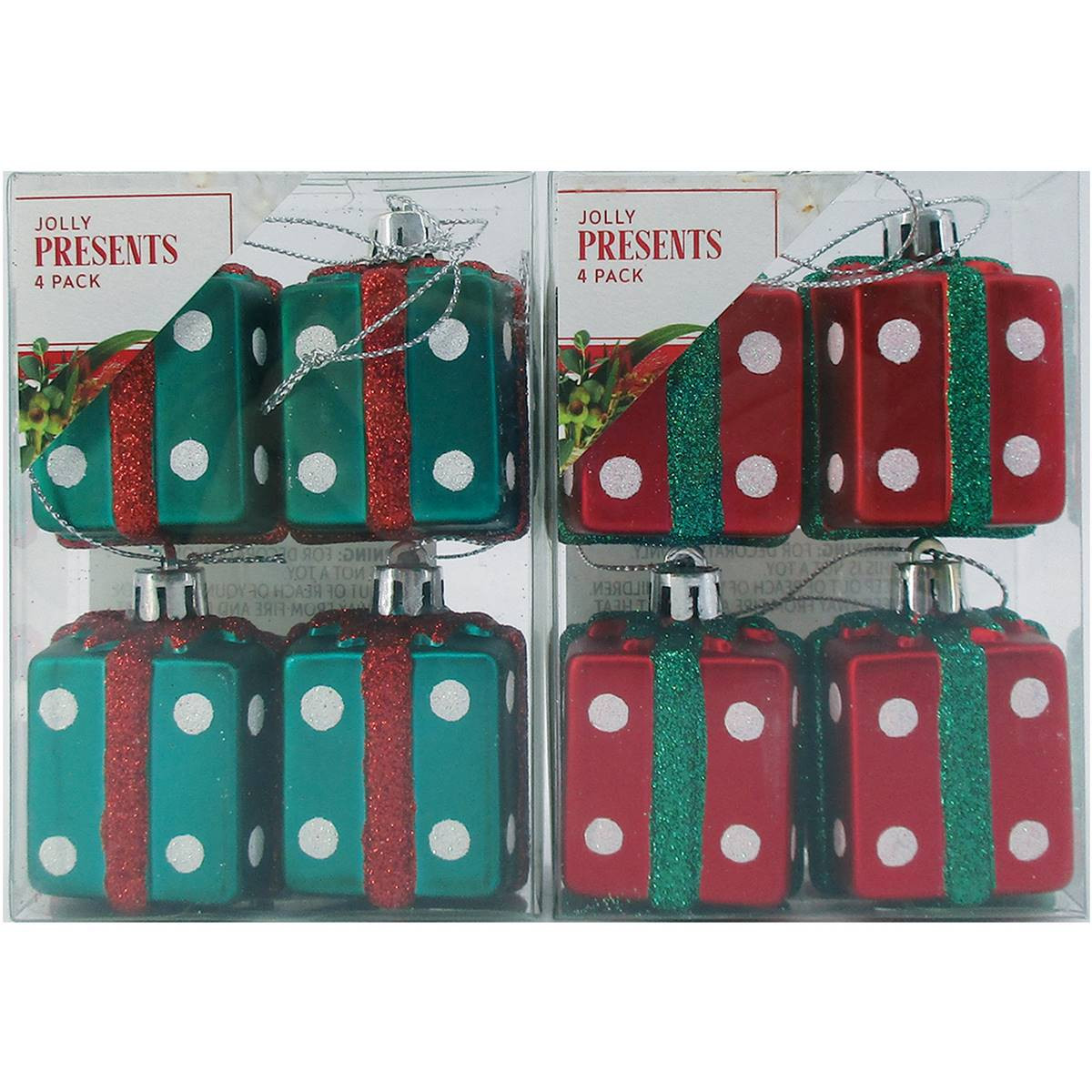 Decorate your tree with our Jolly Present decoration. This decoration will add a great embellishment to your tree and comes in a pack of 4. Height: 6cm