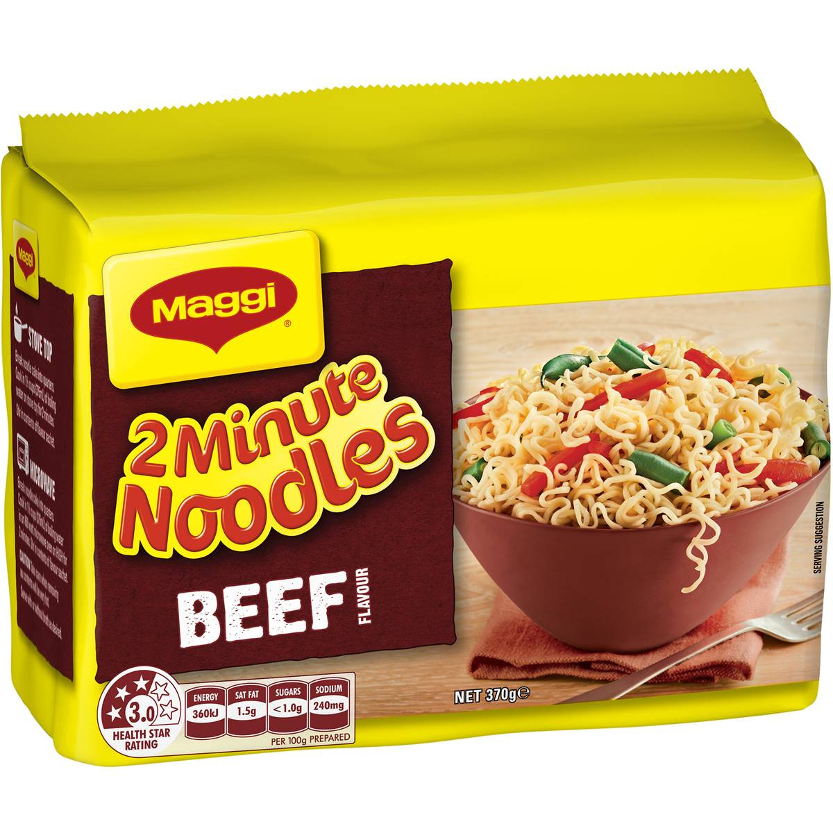 A fun and tasty snack MAGGI 2 Minute Noodles are ready in an instant! MAGGI Beef 2 Minute Noodles can be enjoyed as an easy snack or as a base for a quick meal. Simply break the noodle cake into quarters and cook in 11/2 cups (375ml) of boiling water on the stove top or in an 850 watt microwave oven on HIGH for 2 minutes. Stir in the contents of the flavour sachet. Serve with or without broth as desired. To boost the goodness in your bowl, add lean protein such as cooked chicken, beef or prawns and plenty of vegetables. Make it easy by adding half a cup of mixed frozen vegetables to help increase your daily vegetable intake. Why not try other 2 Minute Noodles flavours such as Chicken or Oriental. MAGGI Beef 2 Minute Noodles has a 3 Health Star Rating and is suitable for vegetarians. Store in a cool dry place. For more quick and delicious fresh meal ideas, visit maggi.au.