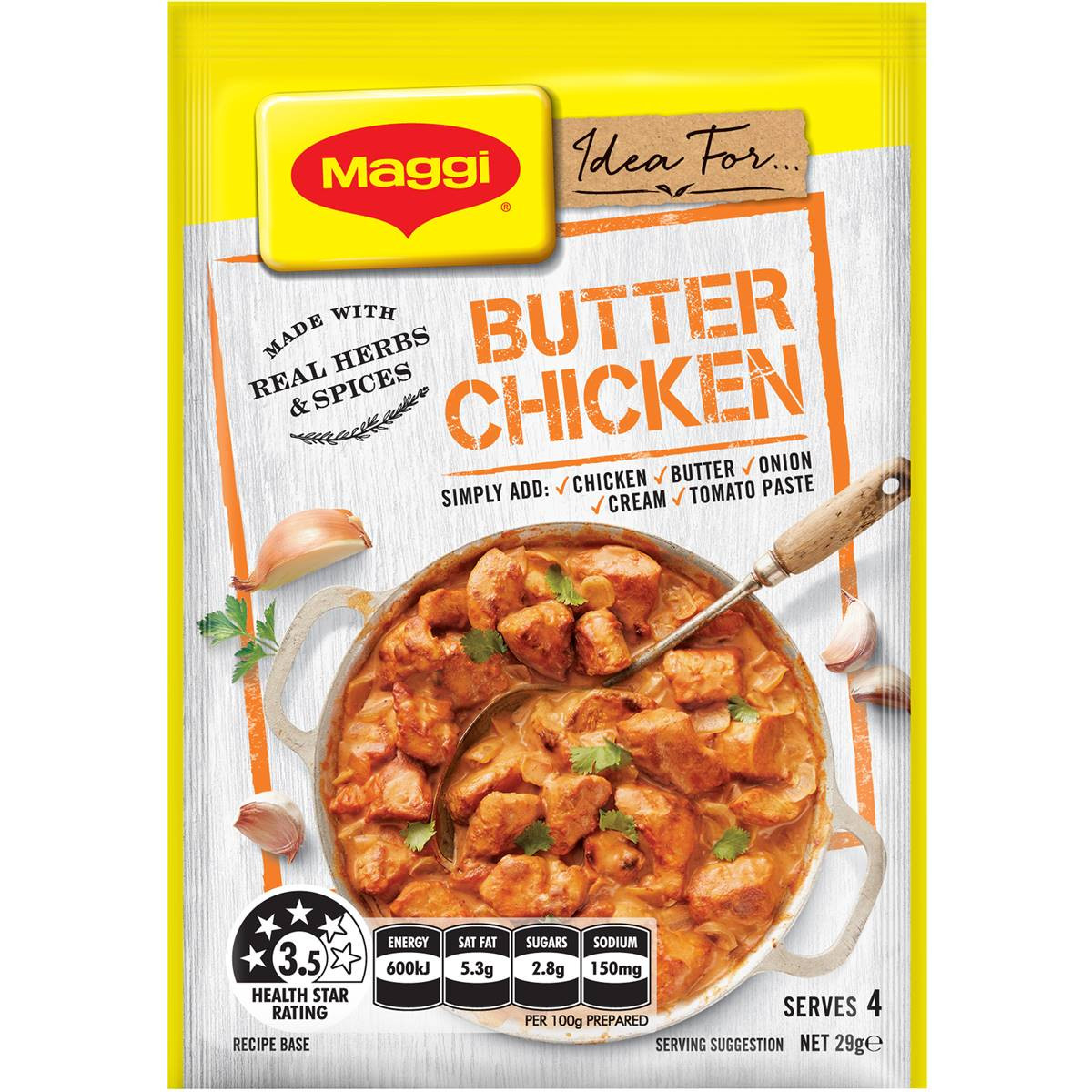 Feature MAGGI Butter Chicken at your next Family dinner. MAGGI Recipe Bases make it easy to create healthy, balanced meals that taste great for you and your family. It's quick and easy, just add: 500g skinless chicken breast, chopped; 1 tbsp (20g) butter; 1 medium onion (150g), chopped; ¼ cup (60ml) tomato paste; 2/3 cup (170ml) cream. Accompany with rice and steamed green vegetables. This meal serves 4 hungry mouths. The Health Star Rating helps you make healthy choices when shopping, by comparing foods within a category. The Health Star Rating for this product is 3.5 Stars. At MAGGI, we are always working to improve the taste, health and nutrition of our products. Adapt the portions on your plate to suit the needs of your family. Also, be sure to balance your meal by filling half your plate with vegetables and salad. If you like this product, why not try one of the other MAGGI Recipe Bases.