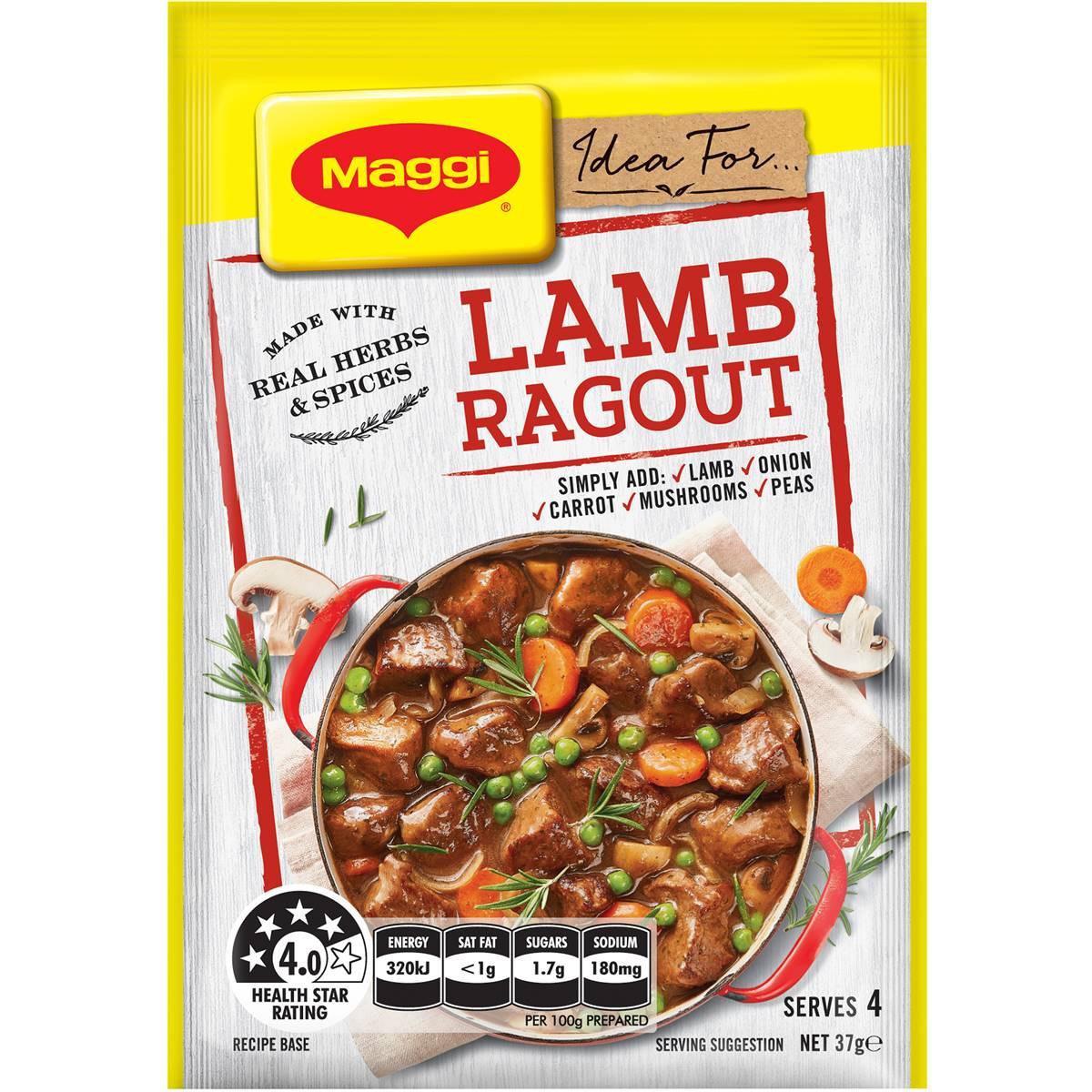 Feature MAGGI Lamb Ragout at your next Family dinner. MAGGI Recipe Bases make it easy to create healthy, balanced meals that taste great for you and your family. It's quick and easy, just add: 500g lean diced lamb; 1 large onion (200g), sliced; 1 medium carrot (120g), sliced; 1,1/2 cup (120g) quartered mushrooms; ½ cup (60g) frozen peas. Accompany with mashed potato and steamed green vegetables. This meal serves 4 hungry mouths. The Health Star Rating helps you make healthy choices when shopping, by comparing foods within a category. The Health Star Rating for this product is 4 Stars. This product is now suitable for a gluten free diet endorsed by Coeliac Australia and New Zealand. At MAGGI, we are always working to improve the taste, health and nutrition of our products. Adapt the portions on your plate to suit the needs of your family. If you like this product, why not try one of the other MAGGI Recipe Bases.