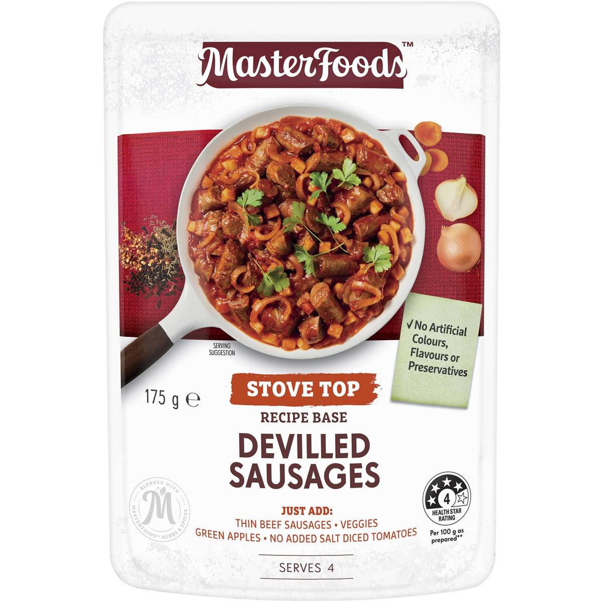 Create a family dinner, packed with flavour with MasterFoods Devilled Sausages Recipe Base Sauce Pouch. Made with quality ingredients including apricots, onion and a blend of spices to deliver classic flavours. Simply add thin sausages, onion, apples and no added salt diced tomatoes for a delicious meal you can enjoy as part of your weekly diet.