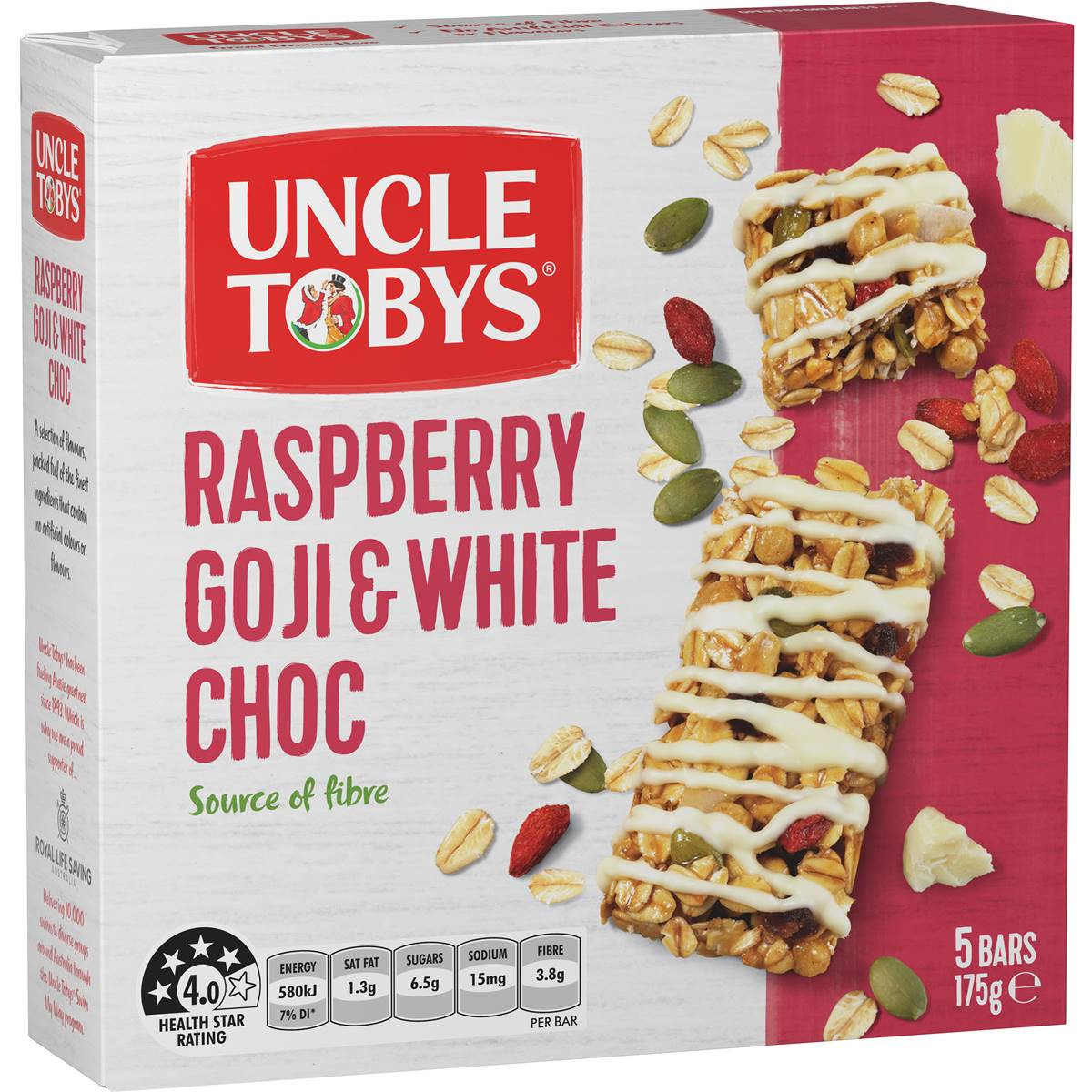 Muesli Blend: [Uncle Tobys Rolled Oats (32%), Wheat (11% ) , Raspberry Pieces (Fruit Purees [(Apple, Pear, Plum), Raspberry Puree (1%)], Concentrated Elderberry Juice, Invert Sugar, Sugar, Humectant [Glycerine], Wheat Fibre, Gelling Agent [Pectin], Food Acid [Citric], Natural Flavour), Breakfast Cereal (Whole Grain Wheat (3%), Wholemeal Wheat Flour, Wheat Bran, Sugar, Vitamin E), Pumpkin Seeds (3%), Goji Berries (3%), Coconut (1%), Milk Powder], Glucose, White Chocolate (7%) (Sugar, Milk Solids, Cocoa Butter, Emulsifiers [ Soy Lecithin, 476]), Chicory Root Fibre, Sunflower Oil, Sugar, Humectant (Glycerine), Modified Starch (1412), Invert Sugar, Honey, Caramelised Sugar, Natural Flavour, Emulsifier ( Soy Lecithin). Contains: Gluten (Wheat and Oats), Milk and Soy May Contain Other Gluten Containing Ingredients and Lupin. Suitable for Vegetarians