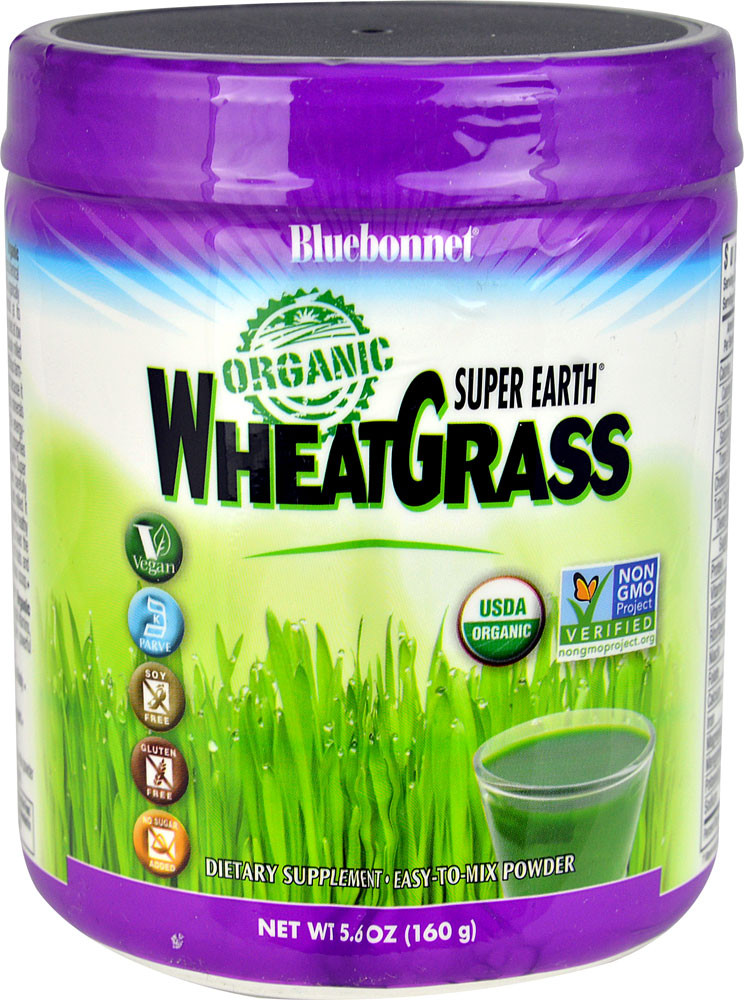 Bluebonnet?s Super Earth Organic WheatGrass Powder provides 100% organic certified and non-GMO verified wheatgrass with no added sweeteners,flavors or colors. It is also gluten-free because it was cut before the grain formed. Wheatgrass is one of the most nutrient-dense foods in the world. It contains mostly chlorophyll, which helps transport these nutrients throughout the body thus providing its rejuvenating and energizing properties. Wheatgrass is also composed of essential vitamins, minerals, enzymes and protein, which contribute significantly to its energy and life-giving qualities.