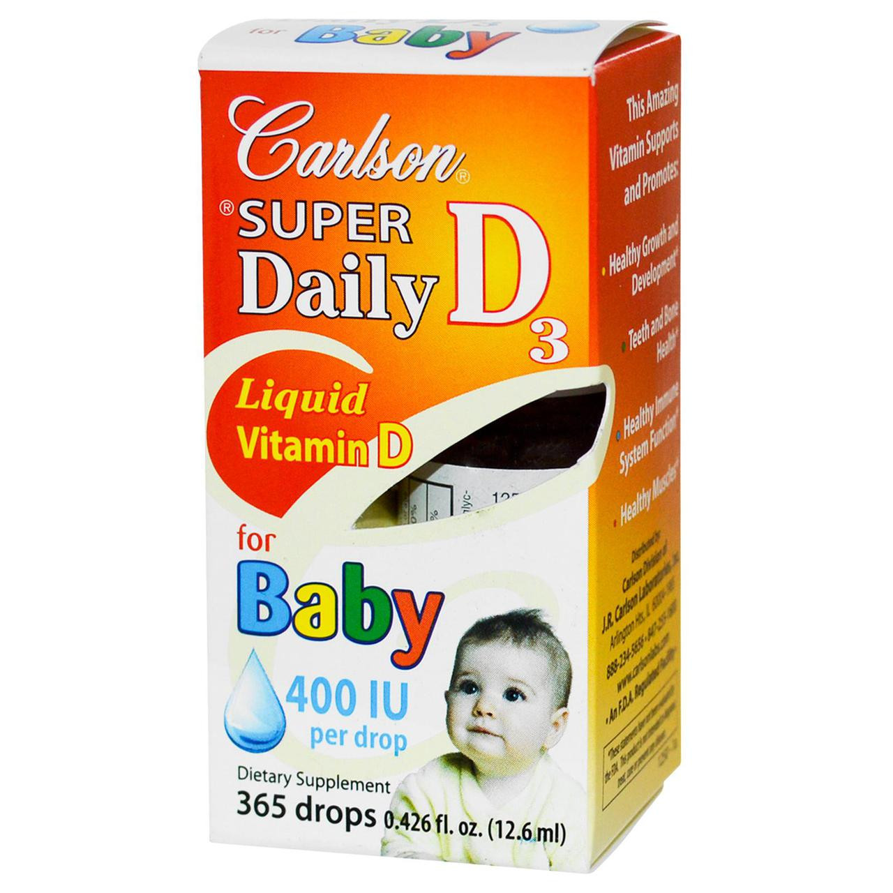 Vitamin D3 plays an important role in overall health, but not everyone gets enough from the sun. Carlson Babys Super Daily D3 provides vitamin D3 in a safe and convenient way. A single drop of Carlson Babys Super Daily D3 supplies 400 IU (10 mcg) of concentrated liquid vitamin D3, the recommended dose of the American Academy of Pediatrics.