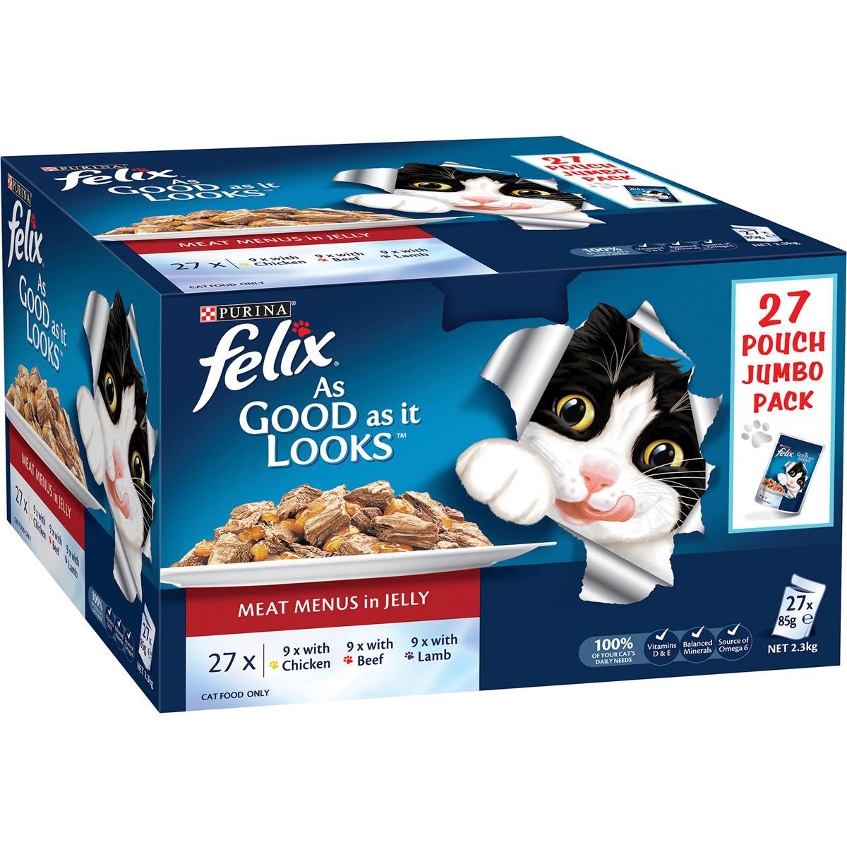 FELIX As Good As It Looks Meat Menu in Jelly Cat Food is made with the ideal combination of VItamins D & E, balanced minerals and Omega 6 Fatty Acids.