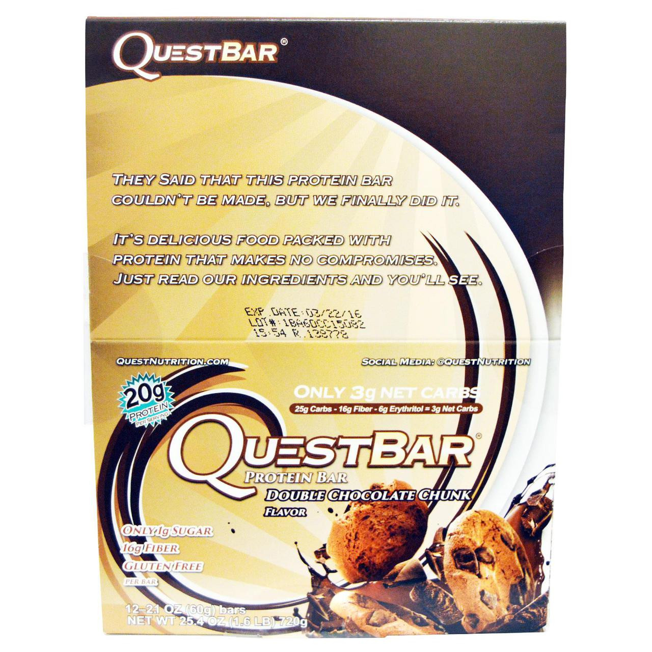 - Quest Nutrition, Protein Bar, Double Chocolate Chunk, 12 Bars, 2.12 oz (60 g) Each
