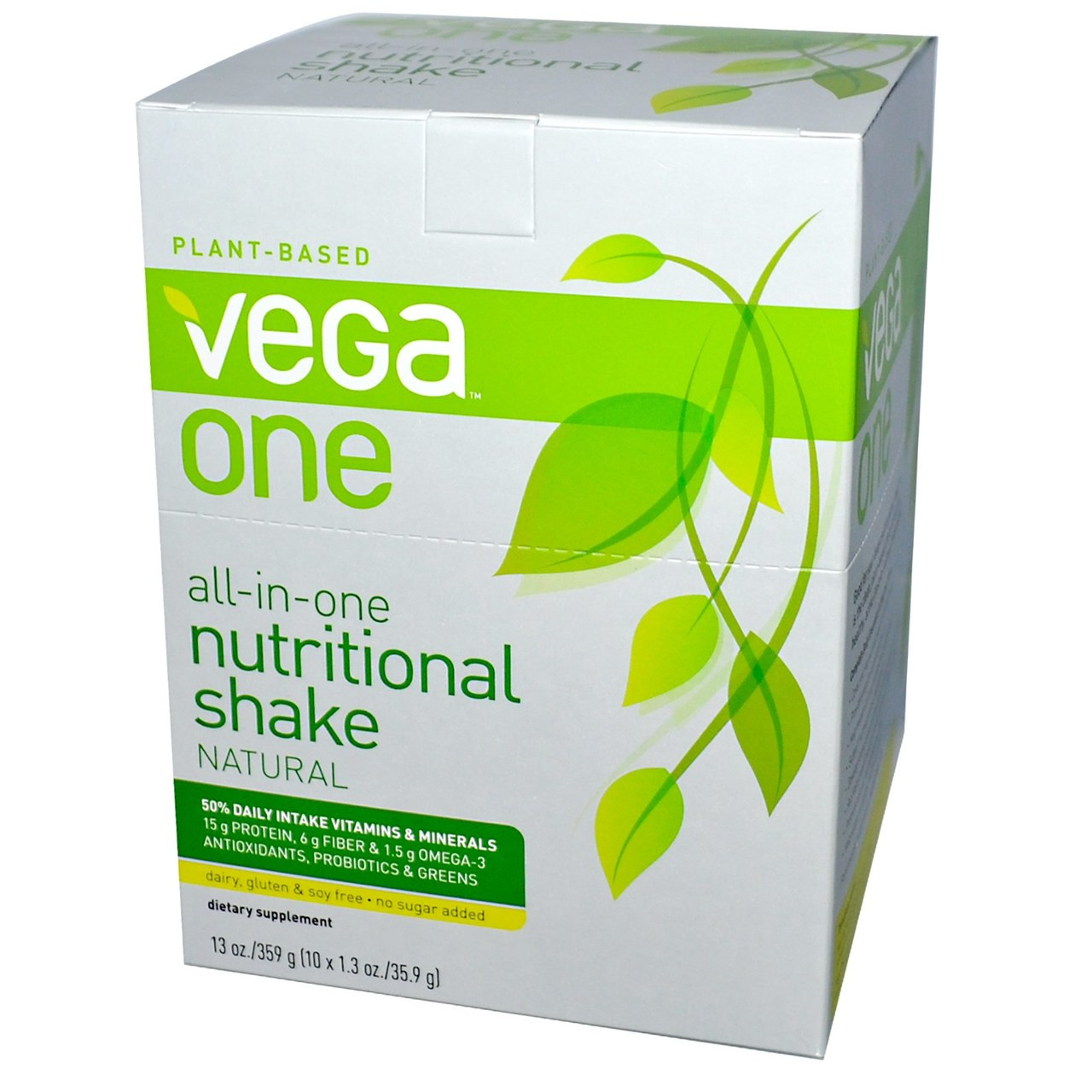 Product OverviewDescriptionAll-in-One Nutritional Shake50% Daily Intake Vitamins & Minerals15 g Protein, 6 g Fiber & 1.5 g Omega-3Antioxidants, Probiotics & GreensDairy, Gluten & Soy FreeNo Sugar AddedDietary SupplementGood for your body and the planet, Vega is the clean, plant-based choice to fuel your healthy, active lifestyleÃ,¯,¿,½without compromiseplete Daily Essential to Help You ThriveCover your key nutrient bases for optimal healthProvide energy to sustain an active lifeHelp metabolize fats, proteins and carbohydratesSupport normal glucose metabolismDevelop strong bones and teeth and maintain healthy skin and eyesFacilitate proper muscle function and repair of connective tissuePromote natural, healthy intestinal floraHelp support a healthy immune system Suggested Use(Adults): Mix one pack of Vega One Nutritional Shake in 1-1.5 cups (250-375 ml) of ice-cold water, juice or non-dairy beverage, shake well and enjoy.Vega One is also a delicious, nutrient-supplementing addition to your favorite smoothie recipeÃ,¯,¿,½just blend and thrive! Take one or more servings daily for optimal health.Other IngredientsNatural vanilla flavor, xanthan gum, stevia leaf extract.WarningsNotice to First-Time Users: As with any positive dietary change, some people may experience temporary cleansing-type symptoms including headaches, constipation, diarrhea and nausea when first taking Vega One. To minimize symptoms, start with one-quarter of a serving and gradually increase intake over the next few weeks. Be sure to drink plenty of water [at least 8 cups a day] with increased dietary fiber intake.Caution: Consult a health care practitioner prior to use if you are taking blood thinners [due to vitamin K] or if you are pregnant or breastfeeding [due to grape seed extract]. People sensitive to niacin may experience mild flushing of the skin. Discontinue use and consult a health care practitioner if you experience the following: Hypersensitivity to flax seed; symptoms of digestive upset [e.g. diarrhea] occur, worsen, or persist beyond 3 days; nausea, fever, vomiting, diarrhea or severe abdominal pain; and immune-compromised condition [e.g. AIDS, lymphoma, patients undergoing long-term corticosteroid treatment]. Keep out of reach of children.Supplement FactsServing Size: 1 pack (1.3 oz/35.9 g)Servings Per Container: 10, Amount Per Serving% Daily ValueCalories123, Calories from fat29, Total Fat3 g6%*Polyunsaturated fat2.2 gÃ,¯,¿,½Total Carbohydrate12 g4%*Dietary Fiber6 g24%*Sugars2 gÃ,¯,¿,½Protein15 g30%Vitamin A (as vitamin A palmitate)2,500 IU50%Vitamin C (as calcium ascorbate)30 mg50%Vitamin D (as )200 IU50%Vitamin E (as d-alpha tocopheryl acetate)15 IU50%Vitamin K (as )40 mcg50%Thiamine (as thiamine HCl)0.75 mg50%Riboflavin0.85 mg50%Niacin11.5 mg60%Vitamin B6 (as pyridoxine HCl)1 mg50%Folate (as folic acid)200 mcg50%Vitamin B12 (as cyanocobalamin)3 mcg50%Biotin15 mcg5%Pantothenic acid (as calcium pantothenate)5 mg50%Calcium (as calcium phosphate tribasic)546 mg50%Iron (as iron pyrophosphate)9 mg50%Phosphorus (as calcium phosphate tribasic and dibasic)550 mg55%Iodine (as potassium iodide)80 mcg50%Magnesium (as magnesium citrate)200 mg50%Zinc (as zinc citrate dihydrate)7.5 mg50%Selenium (as selenium citrate)35 mcg50%Copper (as copper citrate)1 mg50%Manganese (as manganese citrate)1 mg50%Chromium (as chromium citrate)60 mcg50%Molybdenum (as molybdenum citrate)37.5 mcg50%Sodium130 mg7%Potassium (as )750 mg20%Complete Protein BlendPea protein, SaviSeed (sacha inchi), protein, hemp seed protein, sprouted whole grain brown rice protein17,155 mgÃ,¯,¿,½Omega 3 EFA BlendFlax seed, chia seed6,821 mgÃ,¯,¿,½Green BlendChlorella (cracked cell, high CGF), alfalfa (grass), spinach (leaf), broccoli (floret), kale (leaf)1,500 mgÃ,¯,¿,½Antioxidant Blend (ORAC 1000)Grape seed extract, maqui berry, goji fruit, acai berry, pomegranate seed, mangosteen fruit200 mgÃ,¯,¿,½Probiotic blendLactobacillus acidophilus La-14, Bifidobacterium bifidum Bb-021 billion CFUÃ,¯,¿,½Digestive Enzyme BlendProtease (plant and bacterial), aminopeptidase, HemiSEB (amylase, pectinase, phytase, hemicellulase)300 mgÃ,¯,¿,½Organic gelatinized maca root1,000 mgÃ,¯,¿,½Inulin (from chicory root)3,550 mgÃ,¯,¿,½*Percent Daily Values are based on a 2,000 calorie diet.Ã,¯,¿,½Daily Value Not Established.