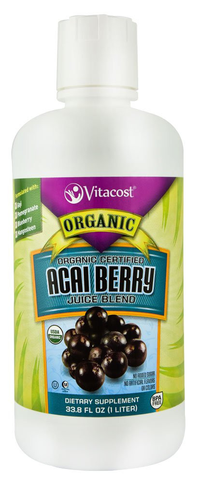 Vitaco Organic Certified Acai Berry Juice Blend is an all-natural liquid supplement featuring an exquisite mix of exotic juices including acai berries, blueberries, and goji, pomegranate and mangosteen fruits. Certified organic with no artificial flavors, colors or added sugar, this refreshing, naturally sweet juice blend can be taken directly by the tablespoon or added to juice or water.