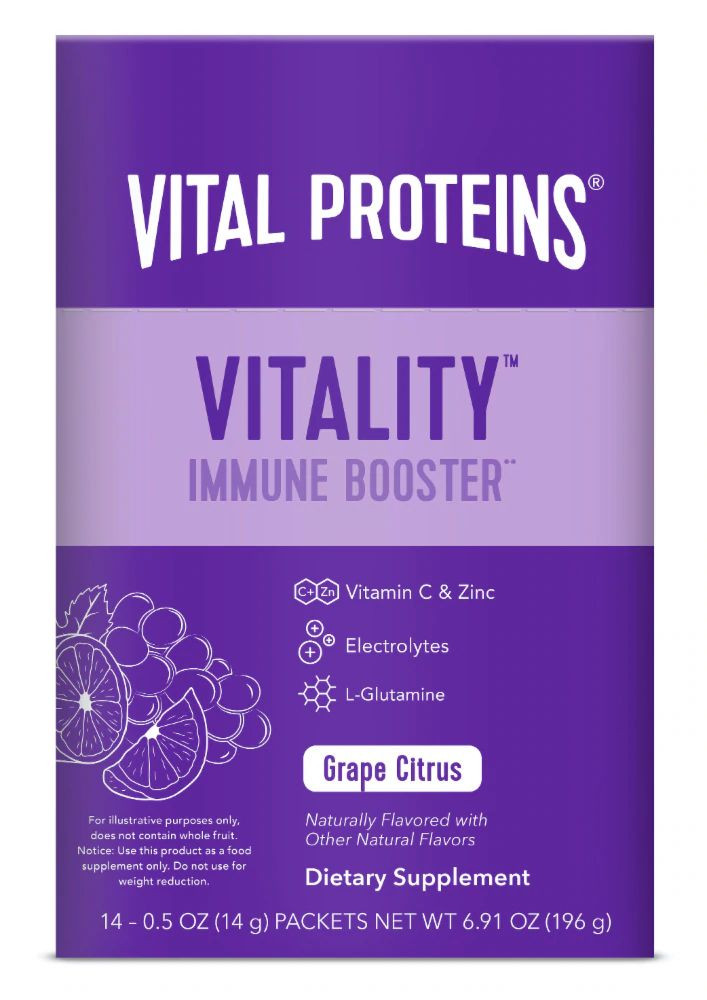 Our New Vital Proteins Vitality? Immune Booster stick packs are here to help keep you at 100 ? no matter the season! This blend combines collagen, L-glutamine, vitamin C, zinc and electrolytes with Wellmune? and Immuno-LP20?, two clinically-proven ingredients that help boost your immune system. Whether you're looking for a proactive immune boost or just a little extra immune support for when you're having an off day, this supplement to help boost the immune system was created so you can conveniently incorporate these on-the-go stick packs into your daily wellness routine.